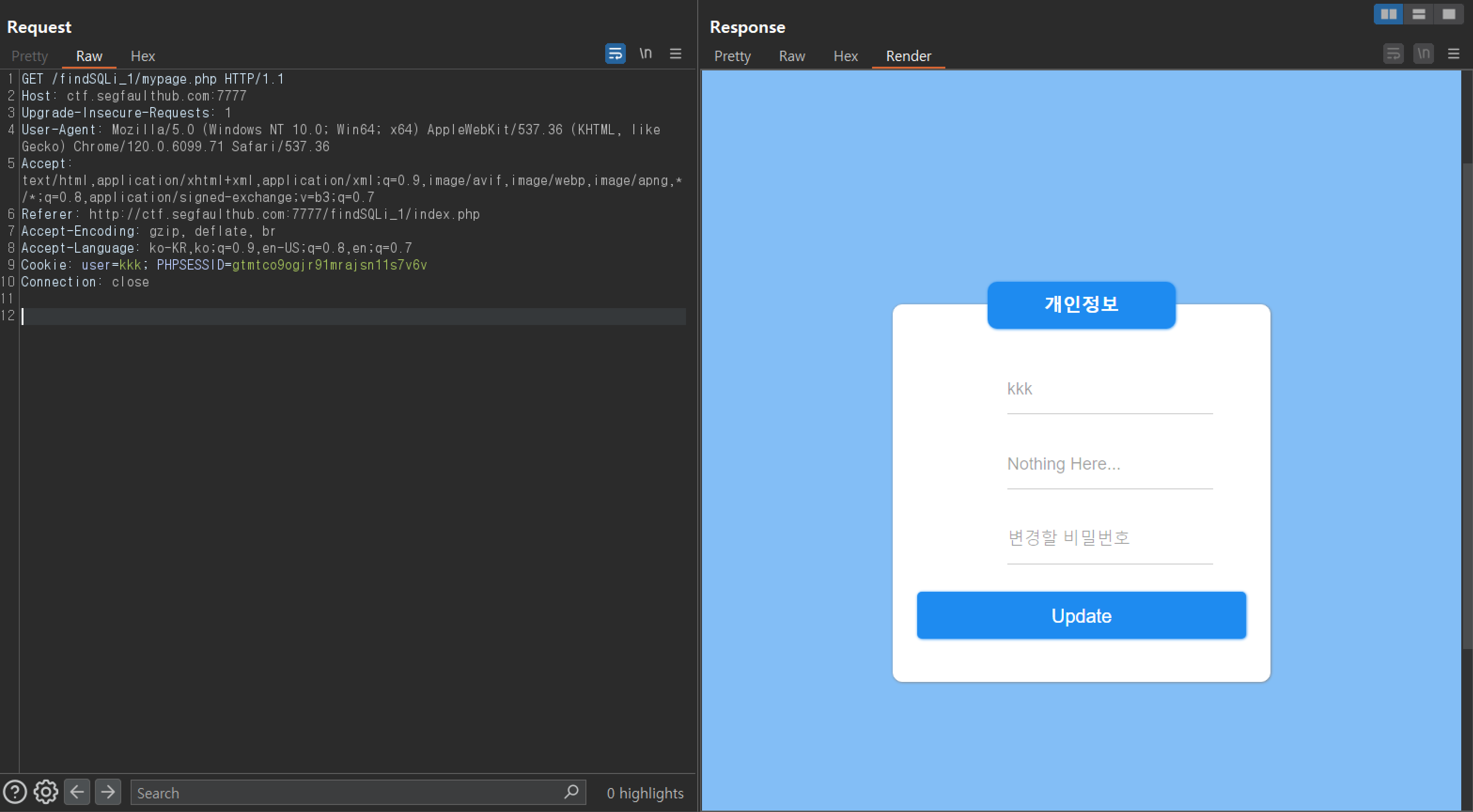 1. 쿠키 SQLi 실습 페이지의 마이페이지를 Burp Suite으로 확인해본 이미지다.