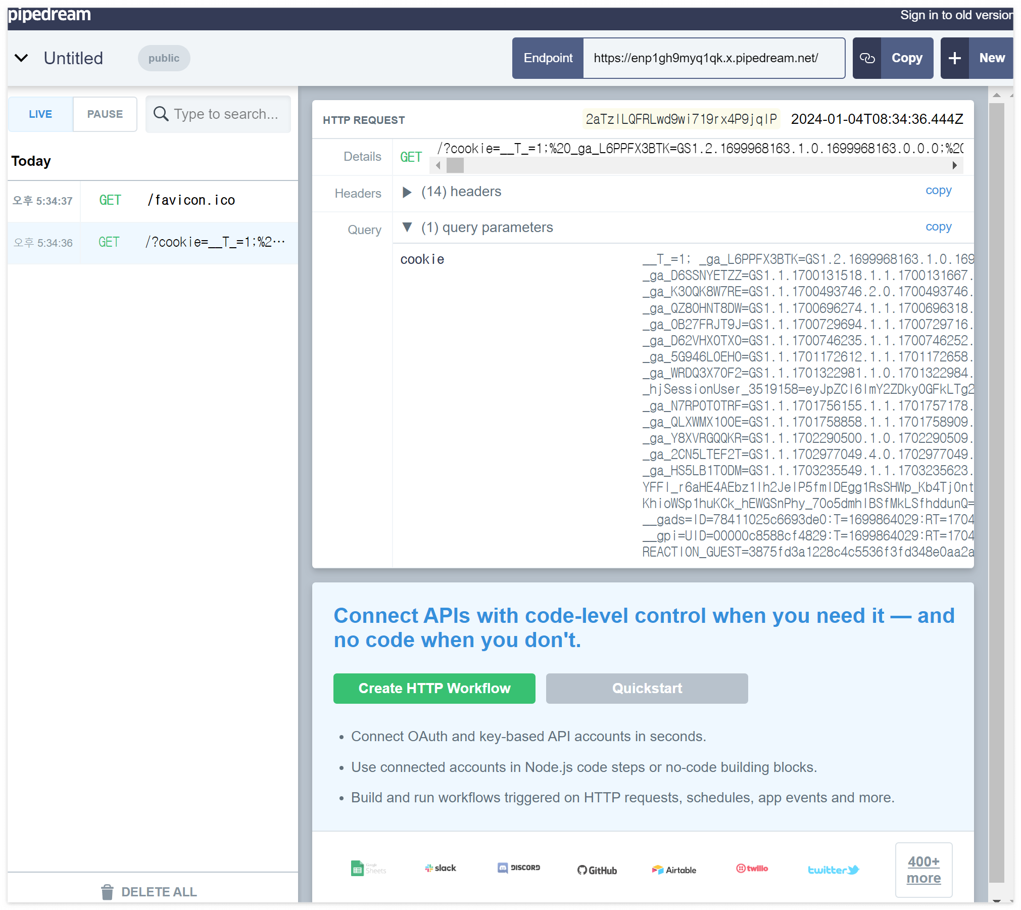 8. requestbin 쿠키 확인 제공된 홈페이지URL에 쿠키 정보를 포함해 입력하면, requestbin 사이트 왼쪽 바에 전달된 쿠키 값을 확인할 수 있다.