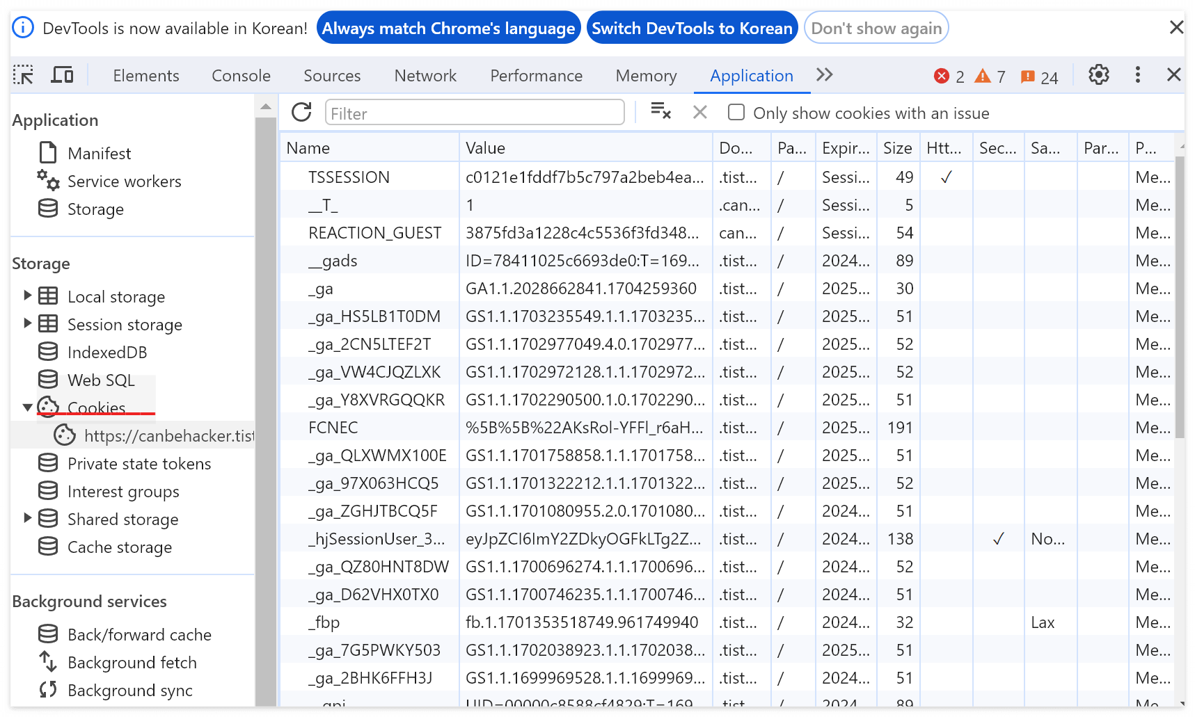 5. 개발자도구(F12) 쿠키 개발자도구 콘솔에 document.cookie를 입력하면, 세미콜론(;)을 기준으로 나뉜 쿠키 정보를 볼 수 있다.
